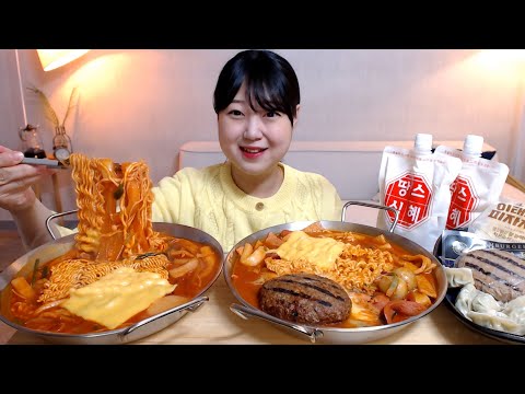맛있는 햄사리가 가득 부대떡볶이와 매운치즈떡볶이 땅스떡볶이 Spicy cheese tteokbokki with noodles Koreanfood Mukbang Eatingsound