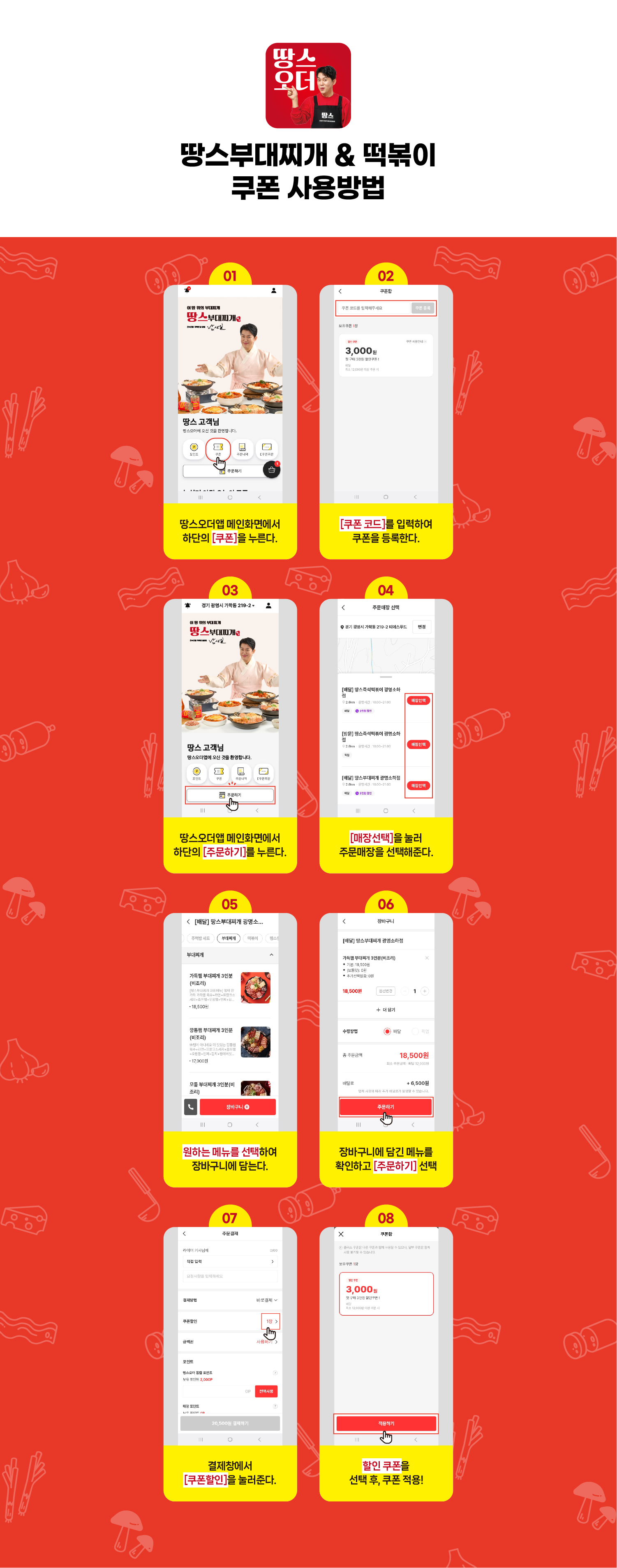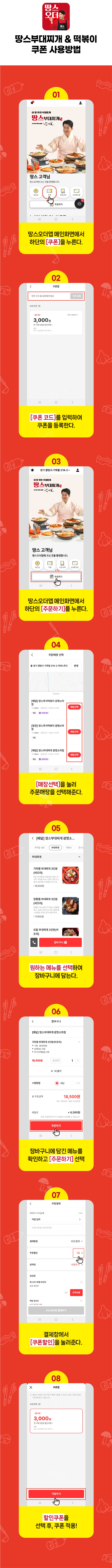 •  메인 메뉴(부대찌개ㆍ떡볶이ㆍ소곱창전골)를 포함한 구매 시 사용이 가능합니다.